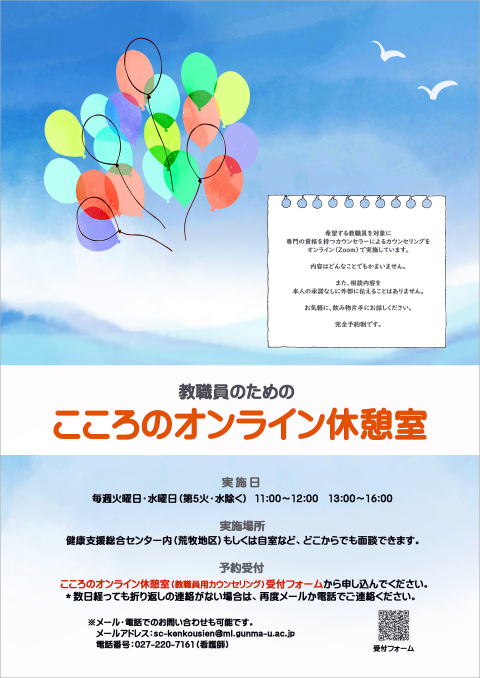 こころのオンライン休憩室(教職員用カウンセリング)受付フォームからお申し込みください。