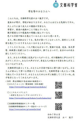 文部科学大臣としても、みなさんの不安や悩みに寄り添いながら、みなさんが安心して学べる学校づくりに向けて、文部科学省一丸となって取り組んでいきますので、みなさんもためらわずに相談してくださいね。必ず味方になってくれる人がいます。