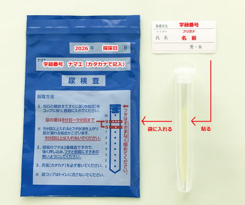 シールに学籍番号と氏名(フリガナ)を記入して試験管に貼り、外袋(採尿日と学籍番号と氏名(カタカナで記入))に入れて提出してください。